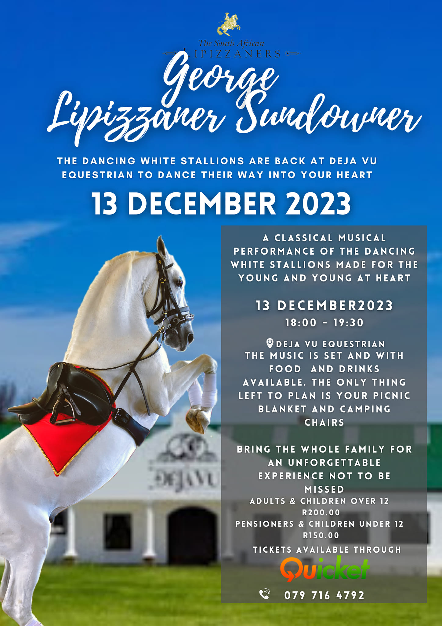 The Dancing White stallions are on the move this festive season and traveling to Deja Vu Equestrian Center in George, bring everyone along to experience the ballet of the Dancing White Stallions.