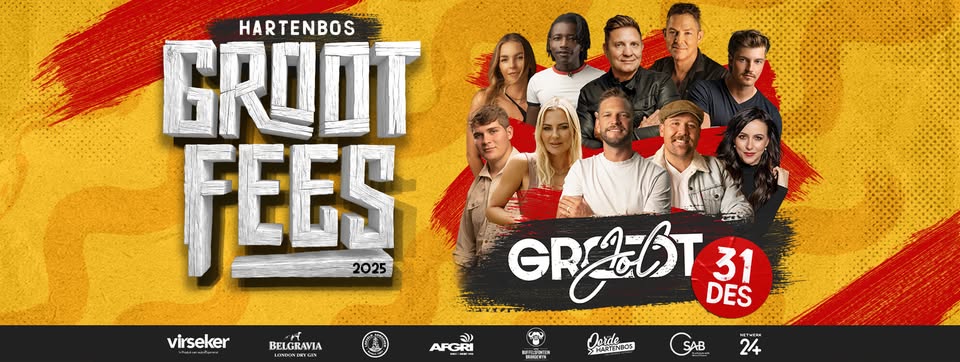 Sluit die jaar af op 31 Desember met ’n oujaarspartytjie soos min. Riaan Benadé, Karlien van Jaarsveld, Appel, Monique Steyn, Kurt Darren, Jay du Plessis, Brendan Peyper, Dodo Nyoka, Chris Steyn en Lisie Basson gaan op die verhoog te sien wees.