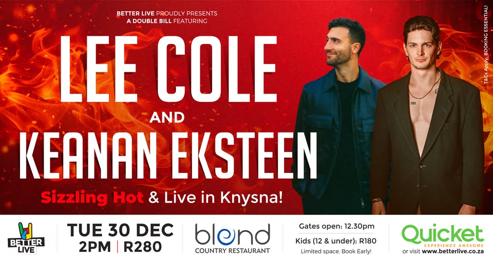 Coming in hot... two of South Africa’s brightest young stars — Lee Cole and Keanan Eksteen — bring their powerful vocals and electric energy to Knysna! Get ready for the kind of live chemistry that turns a great night into an unforgettable one.