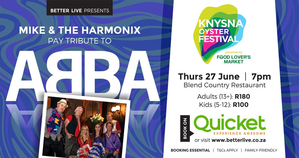 Mike and the Harmonix: a Tribute to ABBA! An official Knysna Oyster Festival Event! Get your dancing shoes on for this ABBA Spectacular! The best sing-along party of the Knysna Oyster Festival!