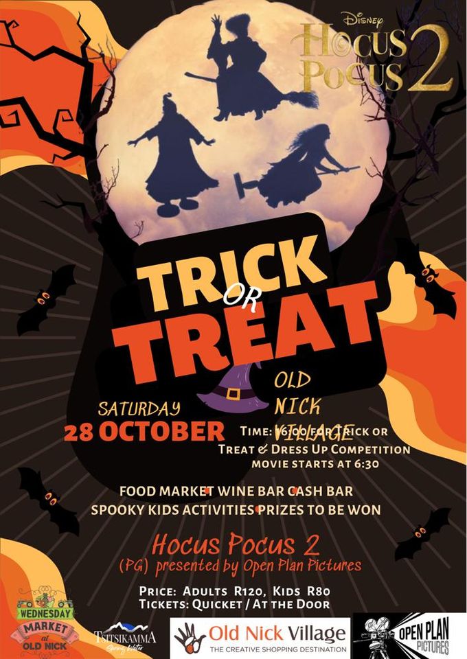 The Pop-Up Market will provide food, snacks and drinks, Nice Neighbour will be open for food and cash bar, Boplaas will be selling wine. Lots of fun and spooky entertainment for the kids!