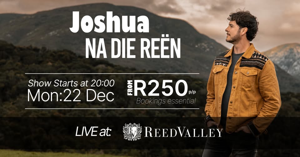 Experience the soulful sounds of Joshua na die Reën as he takes the stage at ReedValley for one special night. With his heartfelt lyrics and captivating melodies, Joshua will transport you through stories of love, loss, and hope beneath our vine-clad trellises.