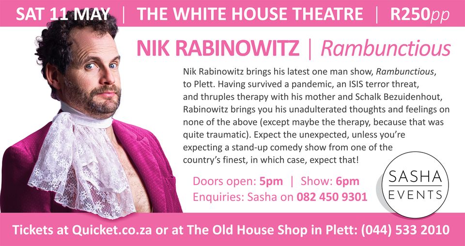 After sensational sold-out Joburg and Cape Town runs, stand-up comic Nik Rabinowitz brings his latest one man show, Rambunctious, to Plett