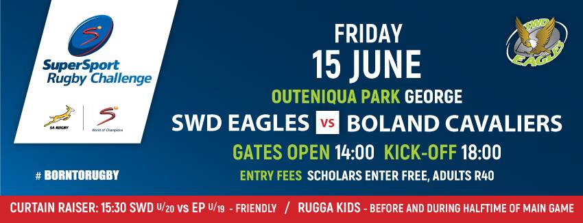 Outeniqua Stadium Rugby on June 15 2018 Gates open: 14:00 Kick-off: 18:00 Scolars Free, Aduls R40.00